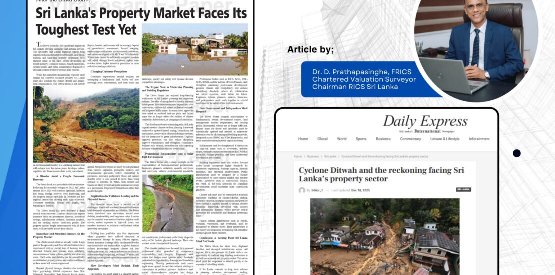 We are pleased to share a featured article by our Managing Director, Dr. D. Prathapasinghe, FRICS, published in Virakesari Newspaper and Daily Express International, on Sri Lanka’s property market after the Ditwa Storm.